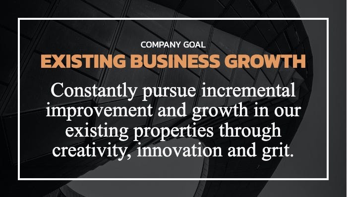Existing Business Growth: Constantly pursue incremental improvement and growth in our existing properties through creativity, innovation and grit.