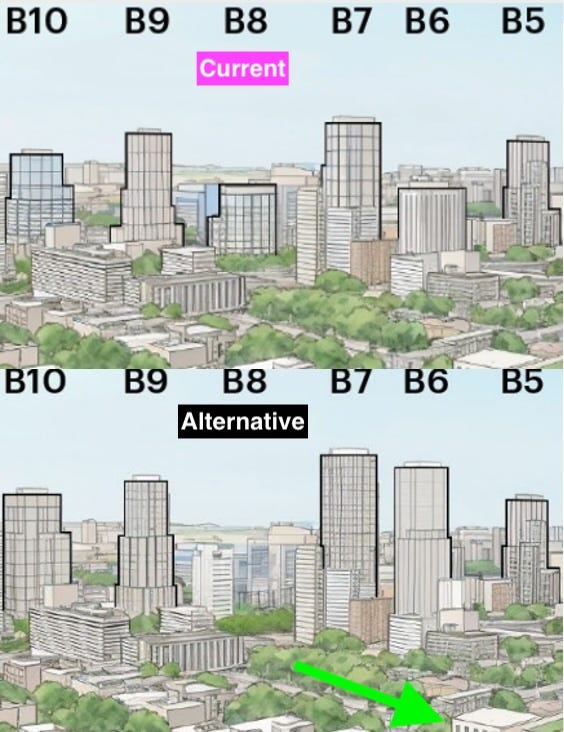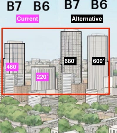 Continuing the comparison, the below image mashes up the B7 and B6 towers from each parcel. (Again, the heights proposed for B7 and B6 are estimates, based on the stated average and other benchmarks within the same panel.)