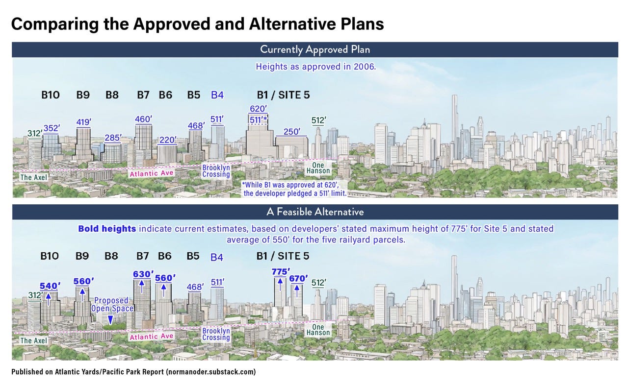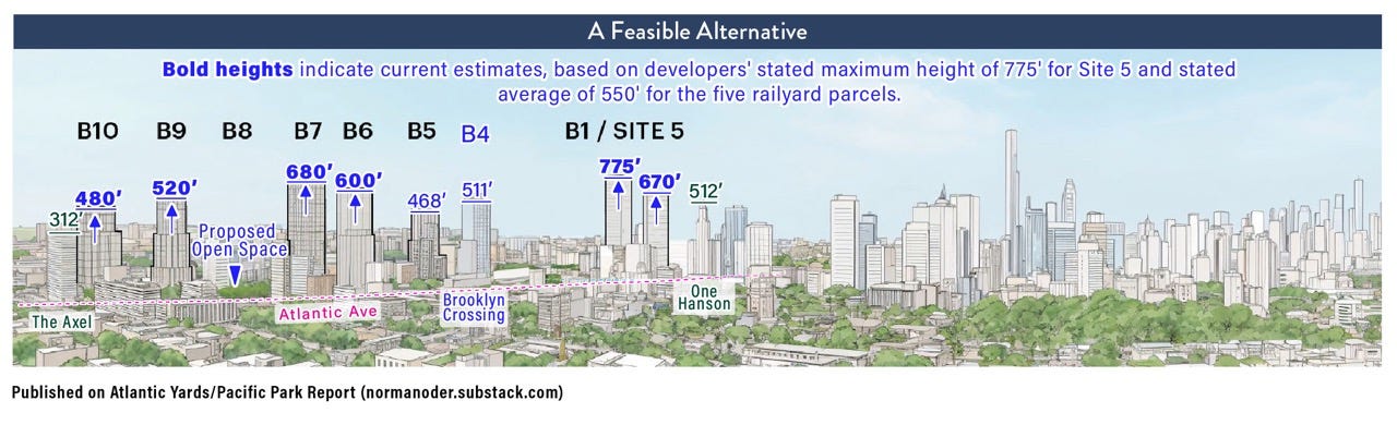 All would be far larger than the four buildings flanking the railyard between Vanderbilt and Carlton avenues, as shown in the photo below, and larger than B4 in the distance. So alternate renderings should be produced from a street-level perspective.