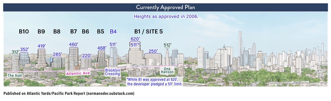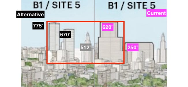 As that rectangle suggests, the approved B1, at 620 feet, seems as tall as the Site 5 tower at left, at 775 feet.