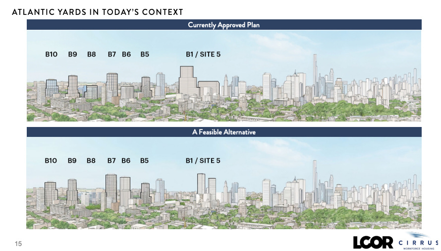 In the slide above, first released publicly at the Nov. 18 workshop on height and density, the developers purportedly contrast the Currently Approved Plan, with six towers planned over the Metropolitan Transportation Authority’s Vanderbilt Yard, with a Feasible Alternative, with only five towers.