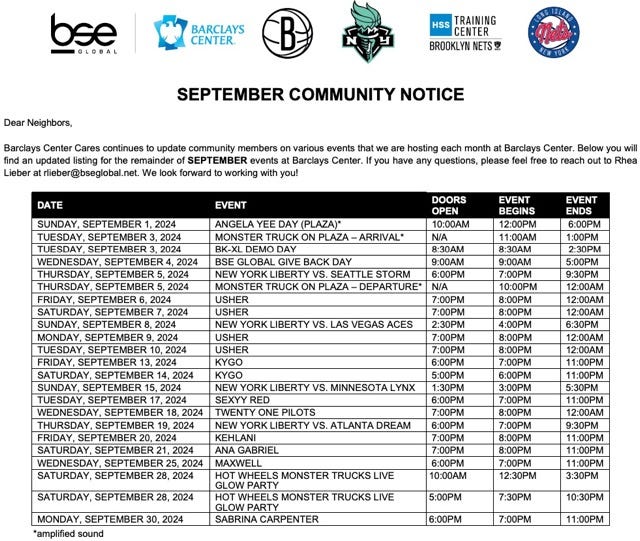 Aug. 30: Barclays Center releases September 2024 event calendar: 18 ticketed events, including 12 concerts, plus a monster truck for 3 days on Ticketmaster Plaza. In other words, it’s public space until it’s not.
