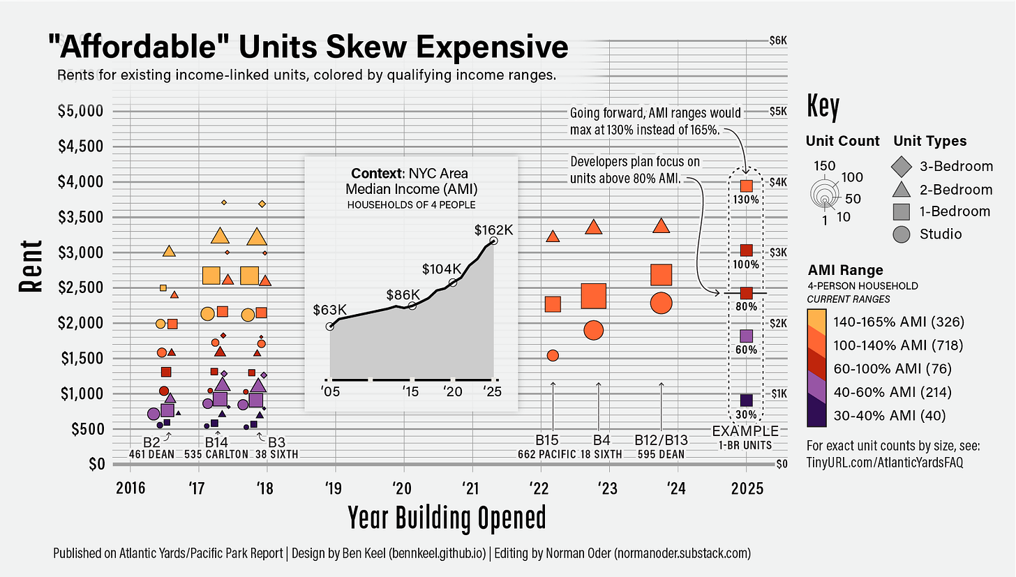 Gothamist, paraphrasing the developer, said the affordable units [would be] reserved for higher-earners than the original plan, in order to make economic sense.” Well, higher-earners due to the rising AMI, but not in terms of percentage of AMI. In fact, the developers have even claimed credit for not seeking even higher AMIs.