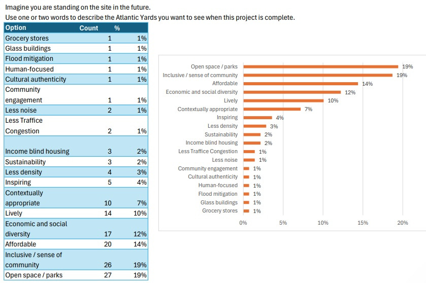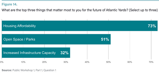 Asked to use one or two words to describe the Atlantic Yards they want to see when this project is complete, 19% chose “open space/parks,” and another 19% chose “inclusive/sense of community.” Also, 14% chose “affordable,” and 12% chose “economic and social diversity.”