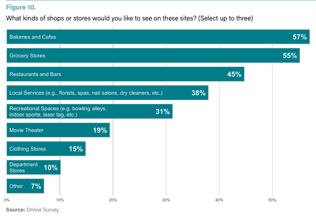 “In order of priority, workshop participants highlighted the need for supermarkets and/or grocery stores and local services, as well as bakeries, cafes, restaurants, and bars,” the report stated.