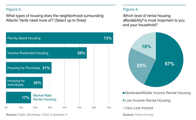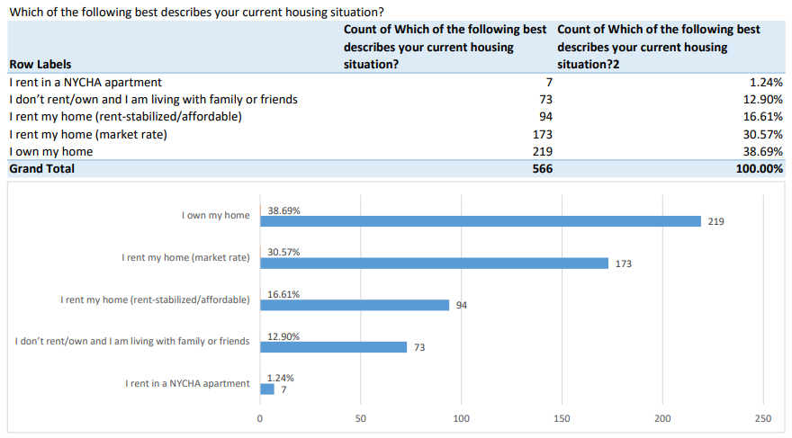 Only 40 respondents, or 8% of those who disclosed their race/ethnicity, identified themselves as Black, while 321, or 66%, identified as white. The feared—and since realized—displacement of Black residents in the neighborhoods around Atlantic Yards has fueled advocates’ calls for affordable housing.