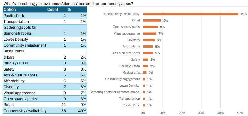 When asked to identify something they love about Atlantic Yards and the surrounding areas, nearly half picked “connectivity/walkability,” with retail and open space/parks far behind.