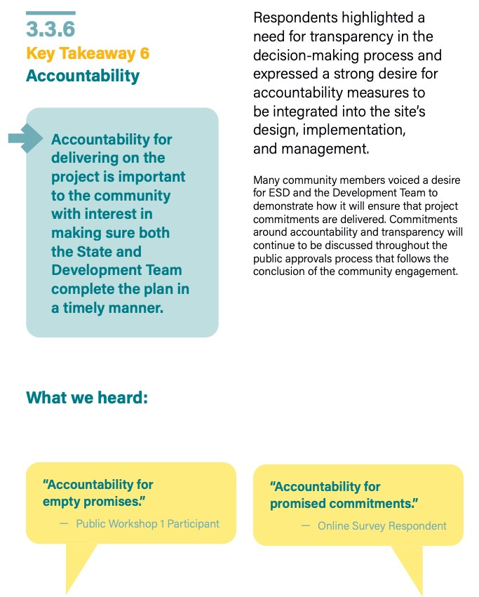 ACCOUNTABILITY: Accountability for delivering on the project is important to the community with interest in making sure both the State and Development Team complete the plan in a timely manner.