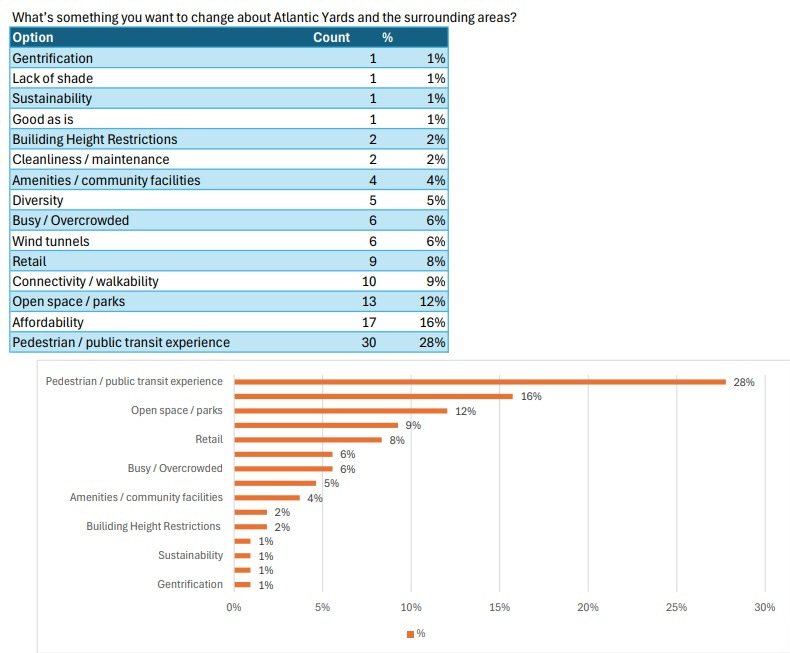 Asked what they’d want to change about Atlantic Yards and the surrounding areas, a plurality (28%) cited the pedestrian/public transit experience, followed by affordability and open space/parks.
