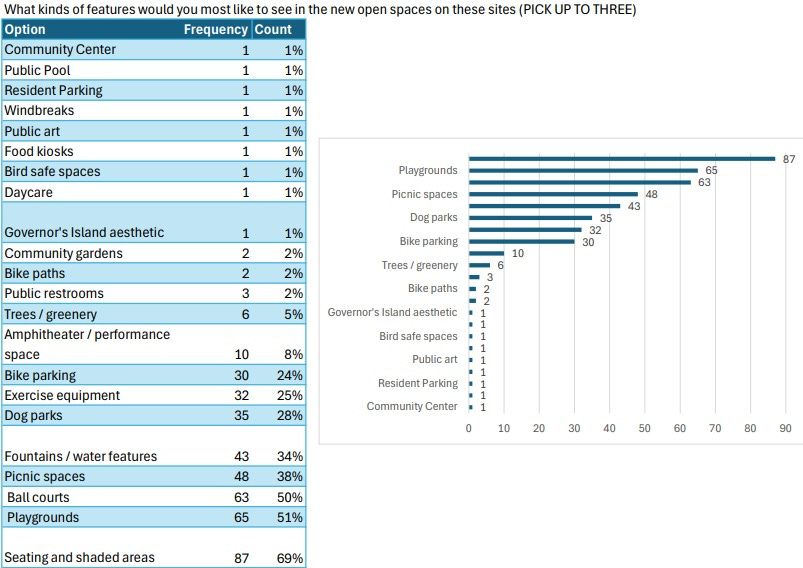 Asked about preferred open space features, they prioritized seating and shaded areas, followed by playgrounds and ball courts.