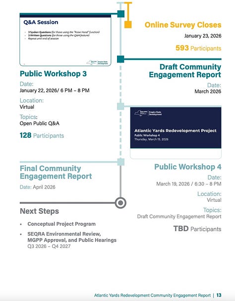 Yesterday, Empire State Development (ESD), the state authority that oversees/shepherds Atlantic Yards, issued the promised Draft Community Engagement Report aimed to “solicit public input on the future development.”