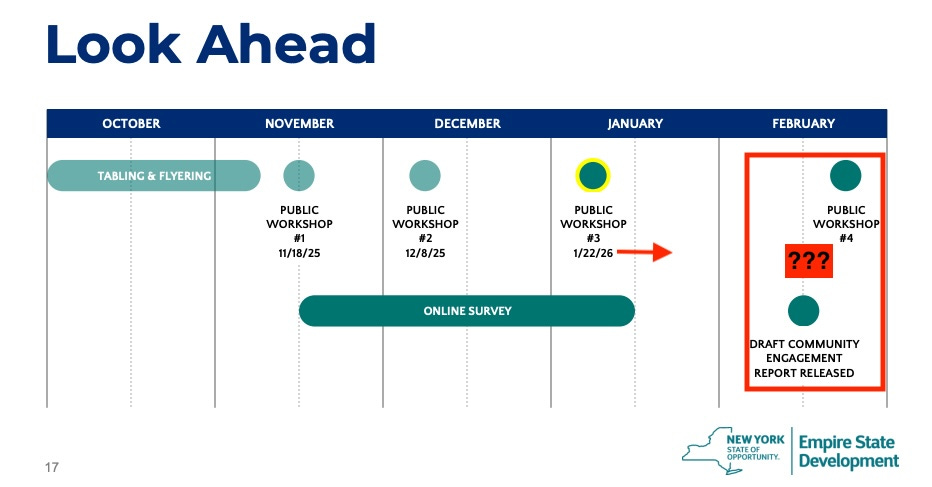 The schedule had already slacked a bit. The chart suggests that Public Workshop #3 was originally to be held in the first half of January. Instead, it was held Jan. 22.