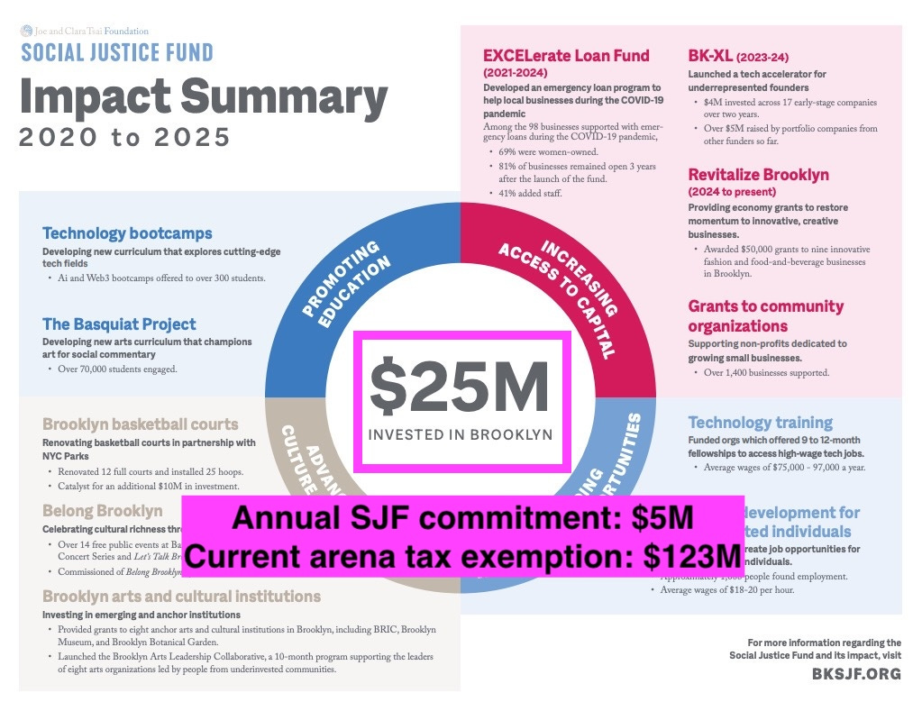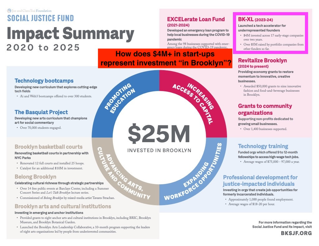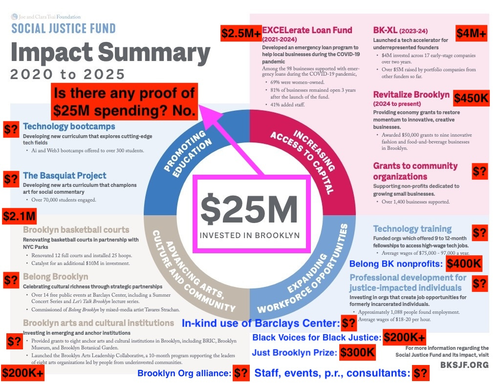 I’m publishing this initial article as a resource for others encountering the Social Justice Fund’s (SJF) new two-page Impact Summary, which states, without financial specifics, that they’ve invested $25 million in Brooklyn, as pledged, over five years. On Jan. 28, I submitted extensive questions to the SJF. See subsequent coverage here.1