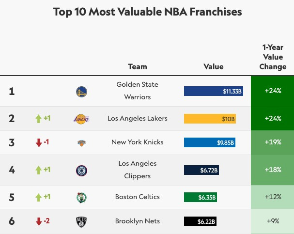 As of last year, Brooklyn Sports & Entertainment—they recently reverted to the old name—was worth $6.22 billion, according to Sportico, and $5.6 billion, according to Forbes.