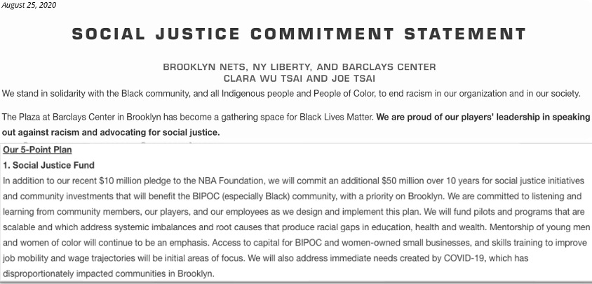 As part of a 5-Point Plan, the Tsais promised “$50 million over 10 years for social justice initiatives and community investments that will benefit the BIPOC (especially Black) community, with a priority on Brooklyn.”