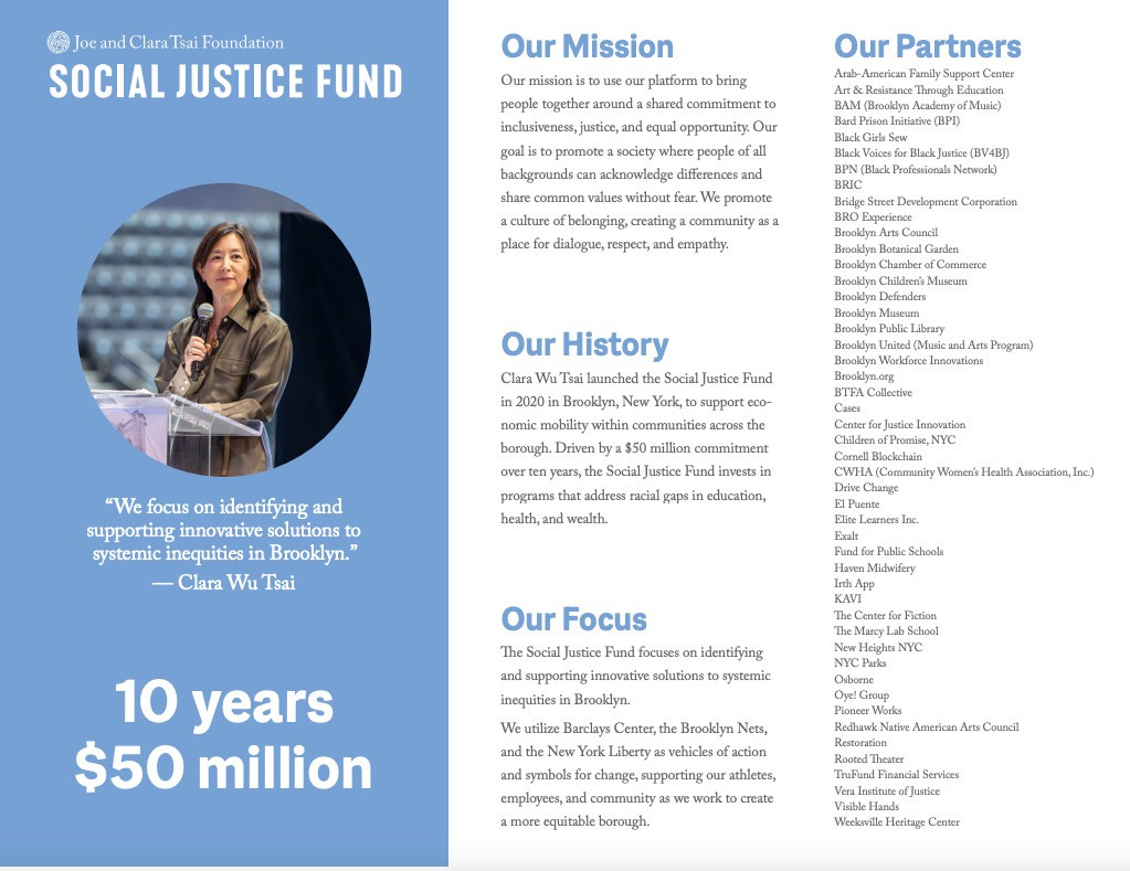 The Social Justice Fund’s first press release, before its website was established, came from the Brooklyn Nets, on Dec. 17, 2020: Joe and Clara Tsai Announce First Five Black Leaders to Receive Grants From Social Justice Fund.