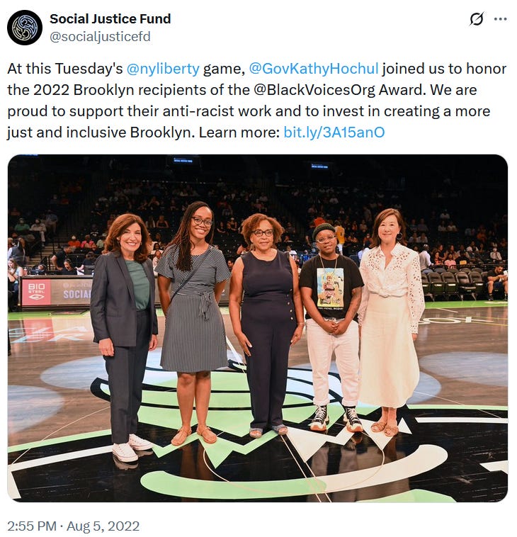 By contrast, the Social Justice Fund’s frequent collaborator, Brooklyn Org, more transparently lists grant recipients and spending. (It gave away about $18.4 million in 2024.)6