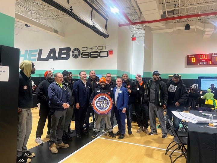 The meeting was “sold out,” in part because of a significant though not overwhelming presence of construction union workers in logo’d jackets, some of whom posed with the development team after the session.