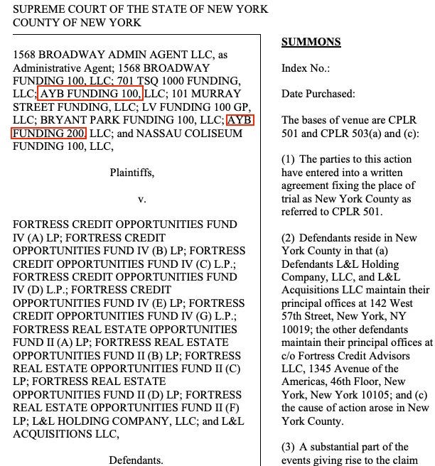 Here’s the case, 1568 BROADWAY ADMIN AGENT LLC et al v. FORTRESS CREDIT OPPORTUNITIES FUND IV (A) LP et al, involving a Times Square hotel, retail, and theater complex, TSX Broadway. Kathryn Brenzel broke the news Feb. 19 in The Real Deal, Lawsuit claims Fortress, L&L owe USIF $890M after TSX Broadway transfer.