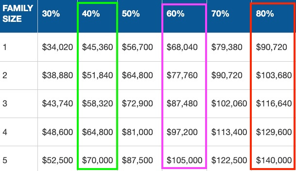 A two-person household at 60% of AMI could earn up to $77,760 as of 2025. Based on a similar percentage increase to that over the past six years, the ceiling could reach $118,006 in 2031.2