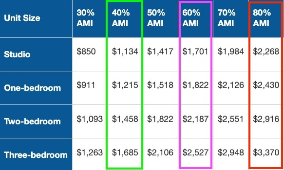 With 500 affordable units projected, averaging 60% of AMI, I estimate 300 apartments at 60% of AMI, 100 at 40% of AMI, and 100 at 80% of AMI.