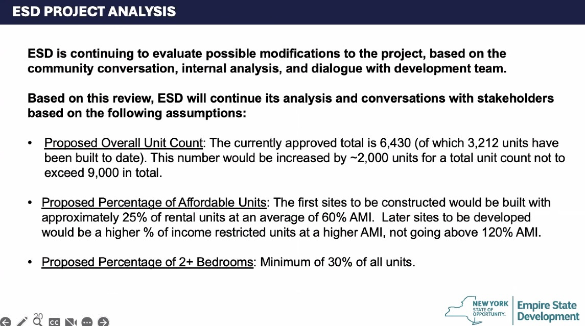 At the first sites to be built, ESD projects 500 low-income affordable units among 2,000 total apartments, averaging 60% of Area Median Income, or AMI.